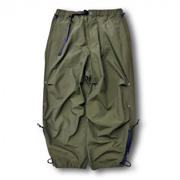 撥水性に富むナイロンリップストップ素材を使用した変形シルエットのワイドパンツ。