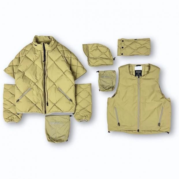 ベースモデルはTAIONのスターターキットサービス。ダウンジャケット、ダウンベスト、ネックウォーマー、ダウンキャップの各アイテムを 一つに融合させて着用が可能なテクニカルな仕様。ジャケットのスリーブは着脱が可能。